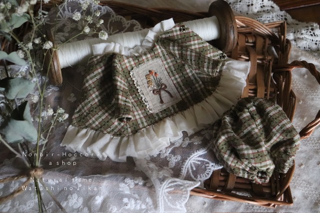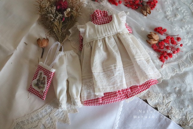 小さな洋品店 - Natural time. - 小さな女の子たちのためのお洋服… かわいいお洋服でお人形さんもおしゃれに.。 ◌ 販売内容 ◌ ギンガムチェックのお洋服set ・ギンガムチェック柄ワンピース…1点 ・ナチュラルエプロンワンピース…1点 ・かぼちゃのペチパンツ…1点 ・小さなbag…1点 ▲1枚目お写真のお洋服1setの販売となります▲ その他はつきませんのでご注意下さい. ▲注意▲ 1つ1つの手作業の為刺繍やレース・飾りのサイズや配置・バランスは個体差があり、お使いの端末によりお色味やバランスなどお写真との誤差がある場合がございます.細かい指定などはできません.ご了承下さい. ▲お洋服の着用感について▲ 当店のお洋服はゆったりふんわりな作りです. ぴったりシルエットをご希望の方はご遠慮下さい. size 22㎝dollさん( ブライス可動ボディ用 ) 当店オリジナル着せ替え人形さん エプロンワンピース 総丈 : 約15㎝ スカート部分 : 約10㎝ ワンピース 総丈 : 約15.5㎝ スカート部分 : 約11.5㎝ ( 首元のフリルは含まず ) パンツ 総丈 : 約 11 ㎝ ( 伸ばした状態で ) bag 約 5.7㎝×4㎝ ( 持ち手は含まず ) 個体差があります. ※エプロンワンピースは大きめデザインです. 当店のトップスと合わせる重ね着用のため、そのまま着るには大きいのです.ぴったりシルエットをご希望の方はご遠慮下さい.