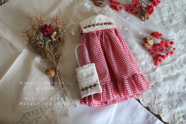 小さな洋品店 - Natural time. - 小さな女の子たちのためのお洋服… かわいいお洋服でお人形さんもおしゃれに.。 ◌ 販売内容 ◌ ギンガムチェックのお洋服set ・ギンガムチェック柄のワンピース…1点 ・小さなbag…1点 ▲1枚目お写真のお洋服1setの販売となります▲ その他はつきませんのでご注意下さい. ▲注意▲ 1つ1つの手作業の為刺繍やレース・飾りのサイズや配置・バランスは個体差があり、お使いの端末によりお色味やバランスなどお写真との誤差がある場合がございます.細かい指定などはできません.ご了承下さい. ▲お洋服の着用感について▲ 当店のお洋服はゆったりふんわりな作りです. ぴったりシルエットをご希望の方はご遠慮下さい. size 22㎝dollさん( ブライス可動ボディ用 ) 当店オリジナル着せ替え人形さん ワンピース 総丈 : 約18.5㎝ スカート部分 : 約14㎝ bag 約 5.5㎝×4.2㎝ ( 持ち手は含まず ) 個体差があります.