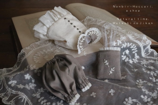 小さな洋品店 - Natural time. - 小さな女の子たちのためのお洋服… かわいいお洋服でお人形さんもおしゃれに.。 レースをたくさん使ったお洋服setです. エプロンワンピースは ボリュームがたくさんあるふんわりなスカートです.ॱ˖ そのほかitemも お人形さんのお部屋に飾ったりお楽しみいただけます. ふんわりとした女の子らしいお洋服setです.◌ ◌ 販売内容 ◌ 冬のお空のお星さまお洋服set ・お星さまエプロンワンピース…1点 ・ナチュラルネイビーワンピース…1点 ・レースのかぼちゃパンツ…1点 ・お星さまの小さなクッション…1点 ・お星さまの小さなbag…1点 ・小さな箒…1点 ・小さな食器5点set…1set ▲2枚目お写真のお洋服1setの販売となります▲ その他はつきませんのでご注意下さい. ▲注意▲ 1つ1つの手作業の為刺繍やレース・飾りのサイズや配置・バランスは個体差があり、お使いの端末によりお色味やバランスなどお写真との誤差がある場合がございます.細かい指定などはできません.ご了承下さい. size 22㎝dollさん( ブライス可動ボディ用 ) ※個体差はあります. エプロンワンピース 総丈 : 約18 ㎝ スカート部分 : 約 12.5 ㎝ ワンピース 総丈 : 約17.6 ㎝ ( 首元のフリル含まず ) スカート部分 : 約 12 ㎝ お袖 : 約 7.5 ㎝ ( 袖口のレース含まず ) パンツ 総丈 : 約 11 ㎝ ( 伸ばした状態で ) 箒 : 約 10.7 ㎝ クッション : 約6 × 5 ㎝ bag : 約 5.5 ×4.3 ㎝ ( 持ち手含まず ) 食器set お皿大 : 直径約 4 ㎝ ・お皿小 : 直径約 2.7 仙 デザート皿 : 約 1.5 × 2.7 ㎝ ティーカップset ソーサー : 直径約 2.5 ㎝ ・ 1 × 1.8 ㎝ ポット : 1.8 × 1.2 ㎝ ( 蓋は外れます ) 個体差があります. ※エプロンワンピースは大きめデザインです. 当店のトップスやワンピースと合わせる重ね着用のため、そのまま着るには大きいです.ぴったりシルエットをご希望の方はご遠慮下さい. ※こちらはハンドメイド商品です. ご理解のある方のみご購入お願いいたします。 ご購入前に↓の注意事項を必ずご確認下さい. ▲注意▲ 1つ1つの手作業の為刺繍やレース・飾りのサイズや配置・バランスは個体差があり、お使いの端末によりお色味やバランスなどお写真との誤差がある場合がございます.細かい指定などはできません.ご了承下さい. ▲お洋服の着用感について▲ 当店のお洋服はゆったりふんわりな作りです. ぴったりシルエットをご希望の方はご遠慮下さい.