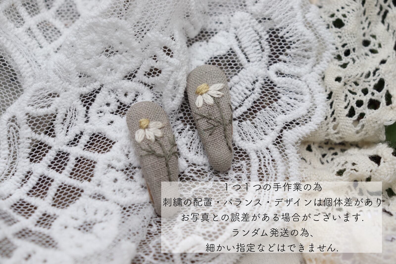 1つ1つの手作業の為刺繍やレース・飾りのサイズや配置・バランスは個体差があり、お使いの端末によりお色味やバランスなどお写真との誤差がある場合がございます.細かい指定などはできません.ご了承下さい.