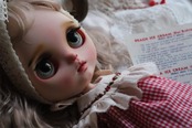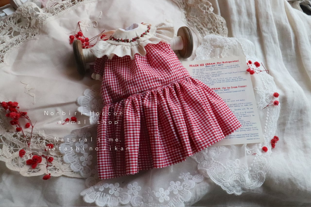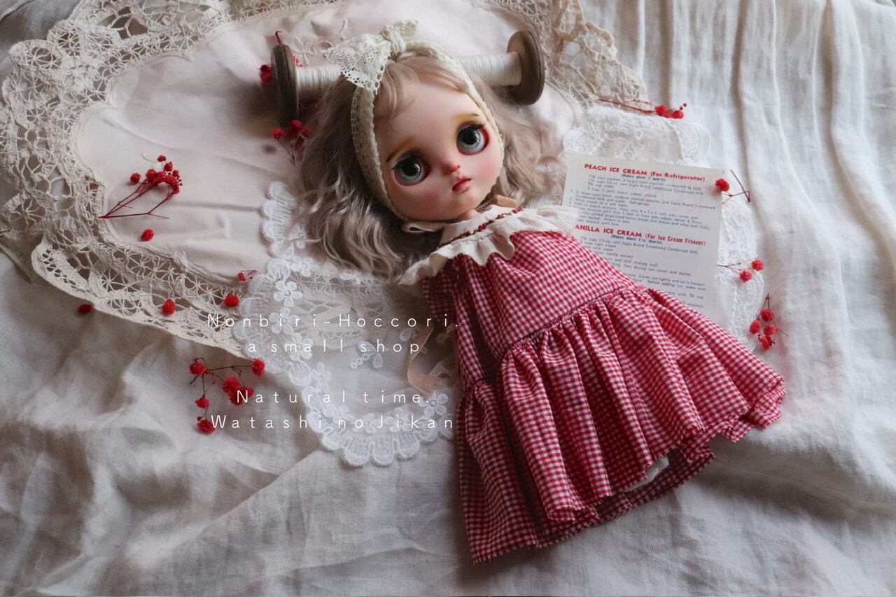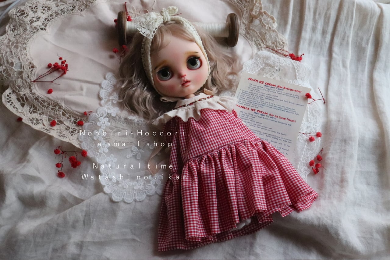 大きめゆったりタイプのお洋服で、スカート丈は床につくタイプです.後ろはスナップボタンでしめるタイプではなく、レースのおりぼんでしばってしめるタイプです.えりなど大きめデザインの為、ブライスさんくらいのお顔の大きさの子・可動ボディさんにおすすめです.