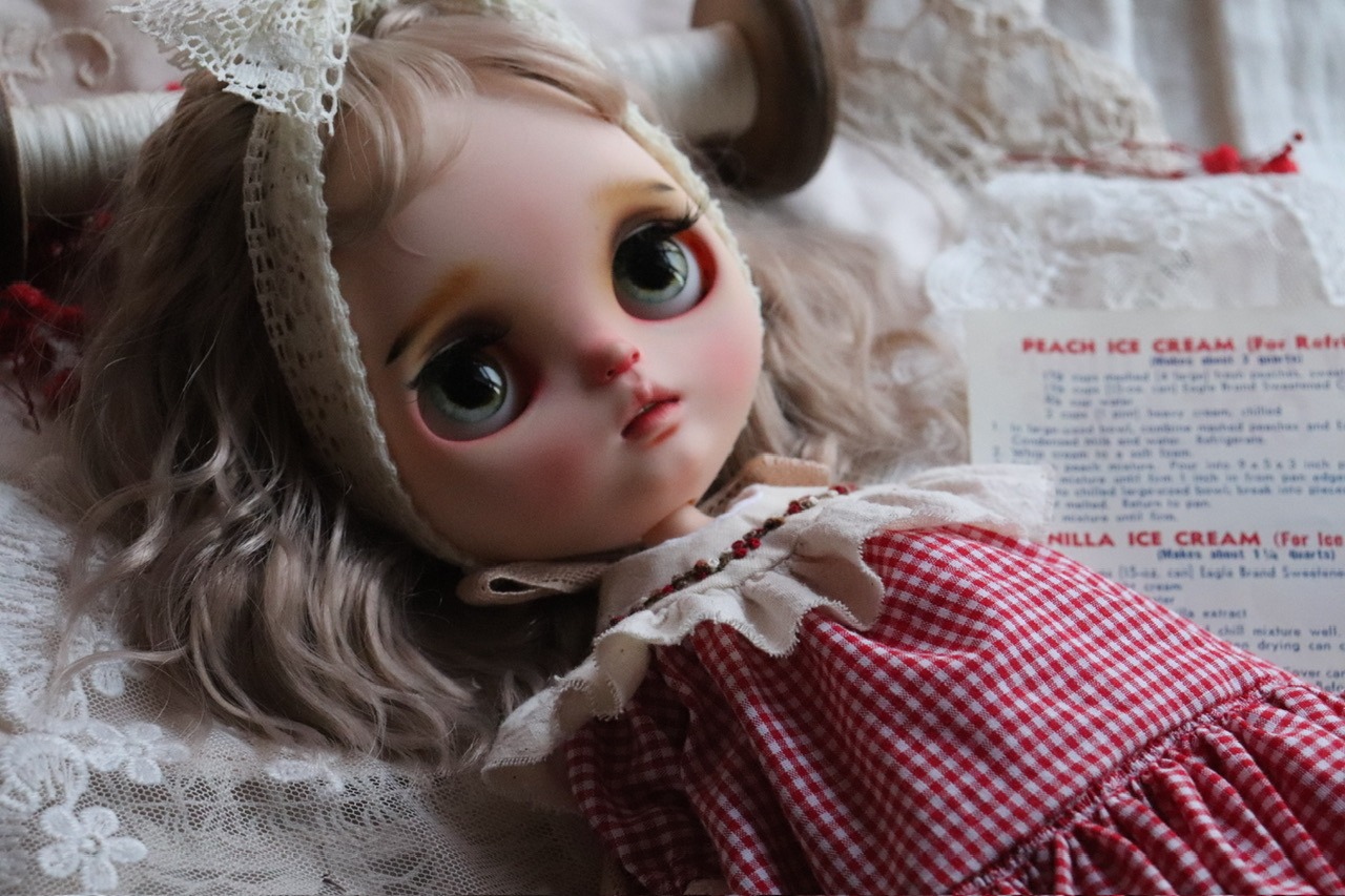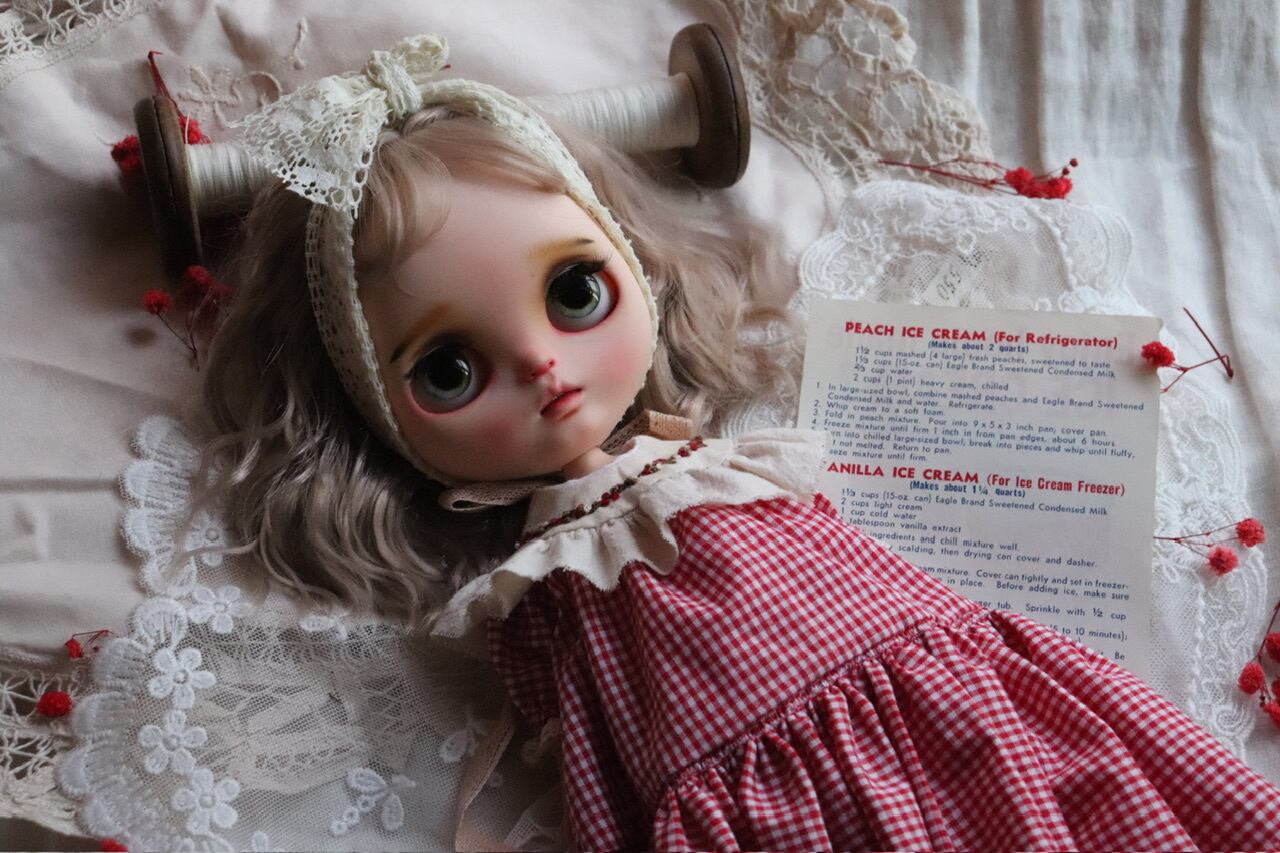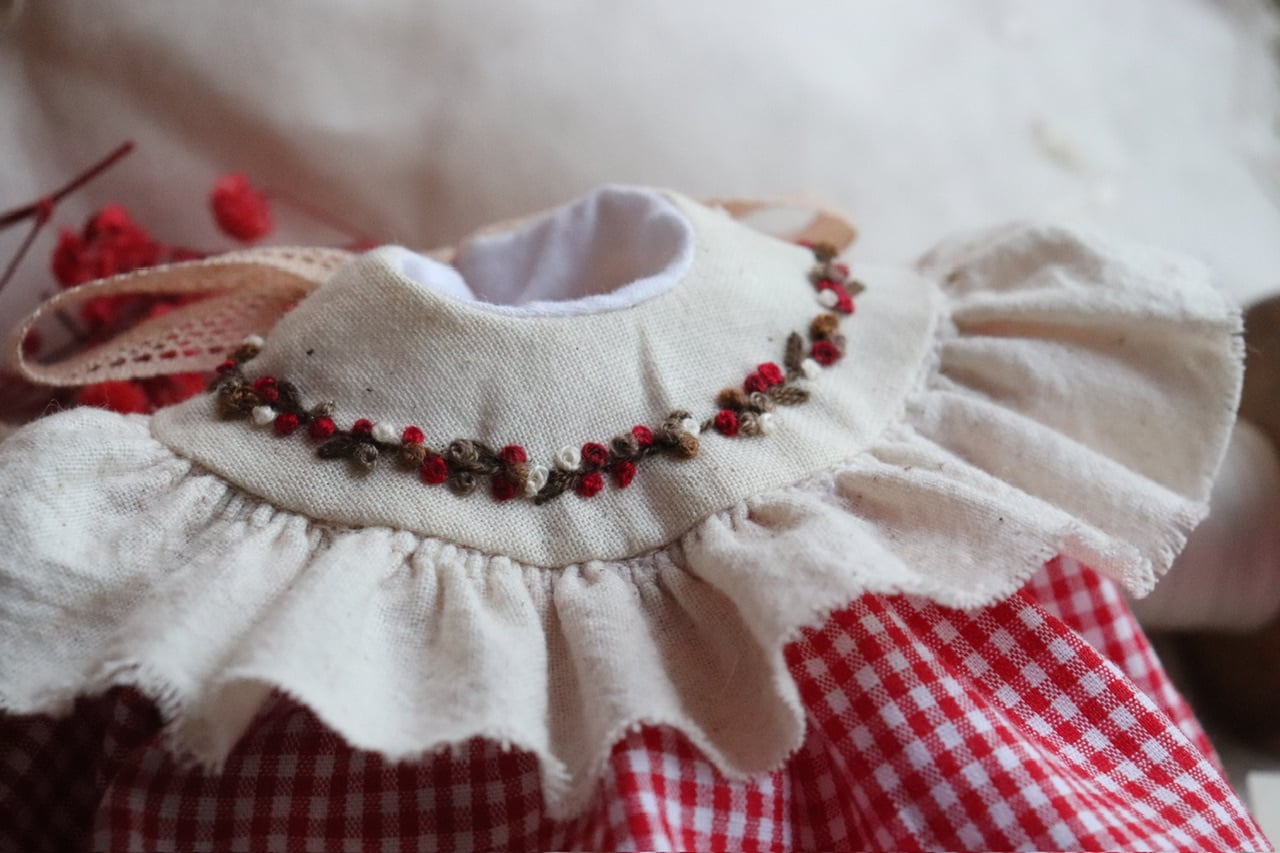 えりなど大きめデザインの為、ブライスさんくらいのお顔の大きさの子・可動ボディさんにおすすめです.ぴったりシルエットをご希望の方はご遠慮下さい.