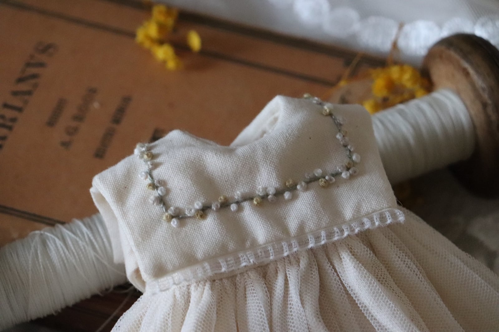 ミモザ刺繍えりのワンピース