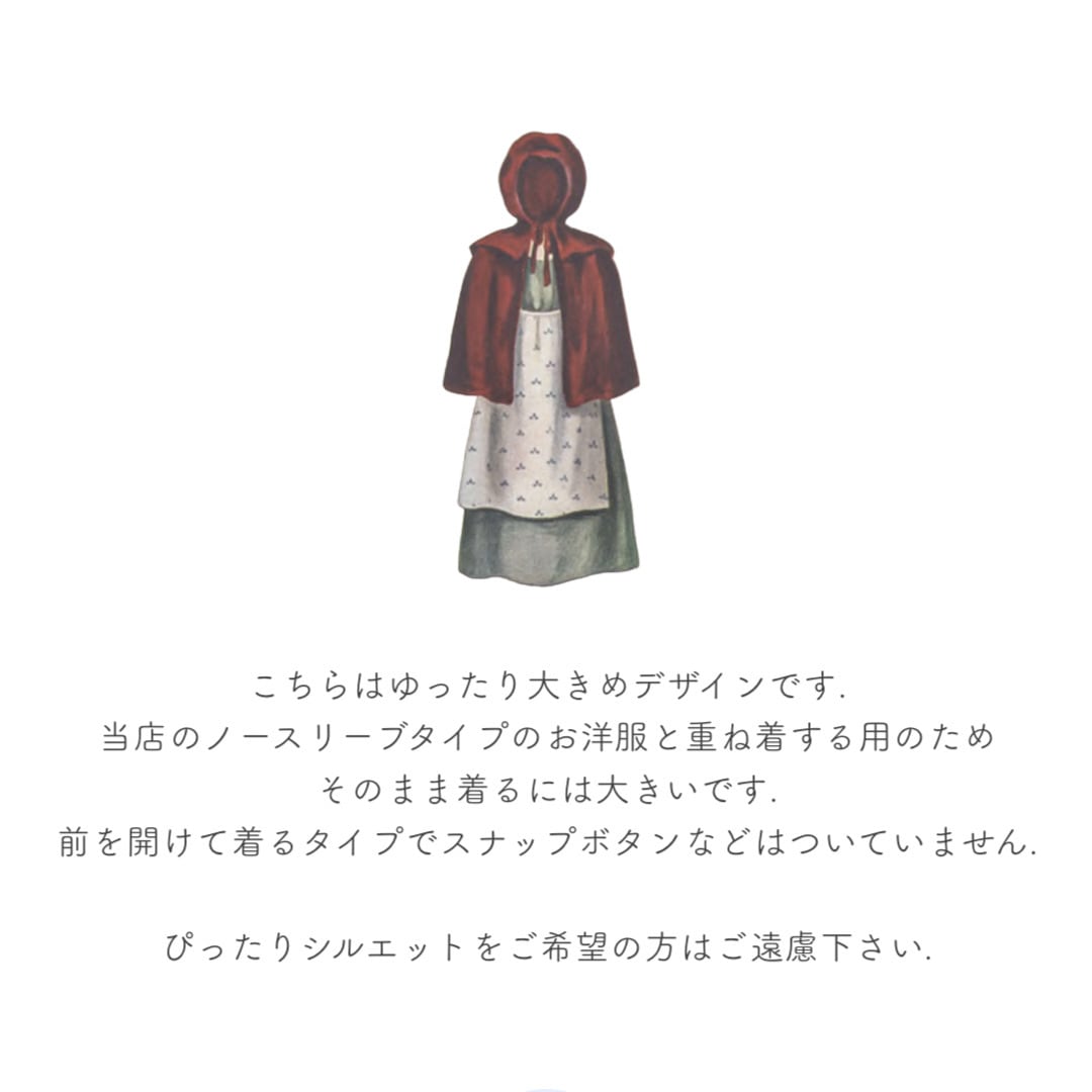 ※こちらはゆったり大きめデザインです.当店のノースリーブタイプのお洋服と重ね着する用のため、そのまま着るには大きいです.前を開けて着るタイプでスナップボタンなどはついていません.