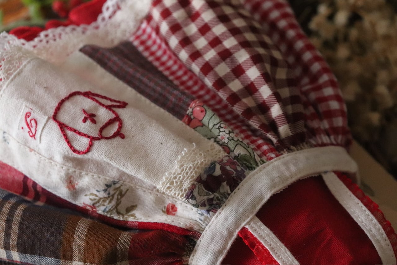 ・ティーポット刺繍のパッチワークエプロンワンピース…1点