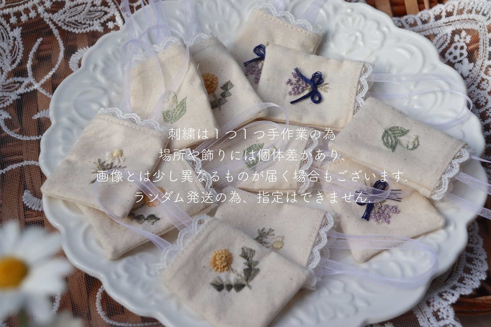 1つ1つの手作業の為刺繍やレース・飾りのサイズや配置・バランスは個体差があり、お使いの端末によりお色味やバランスなどお写真との誤差がある場合がございます.細かい指定などはできません.ご了承下さい.