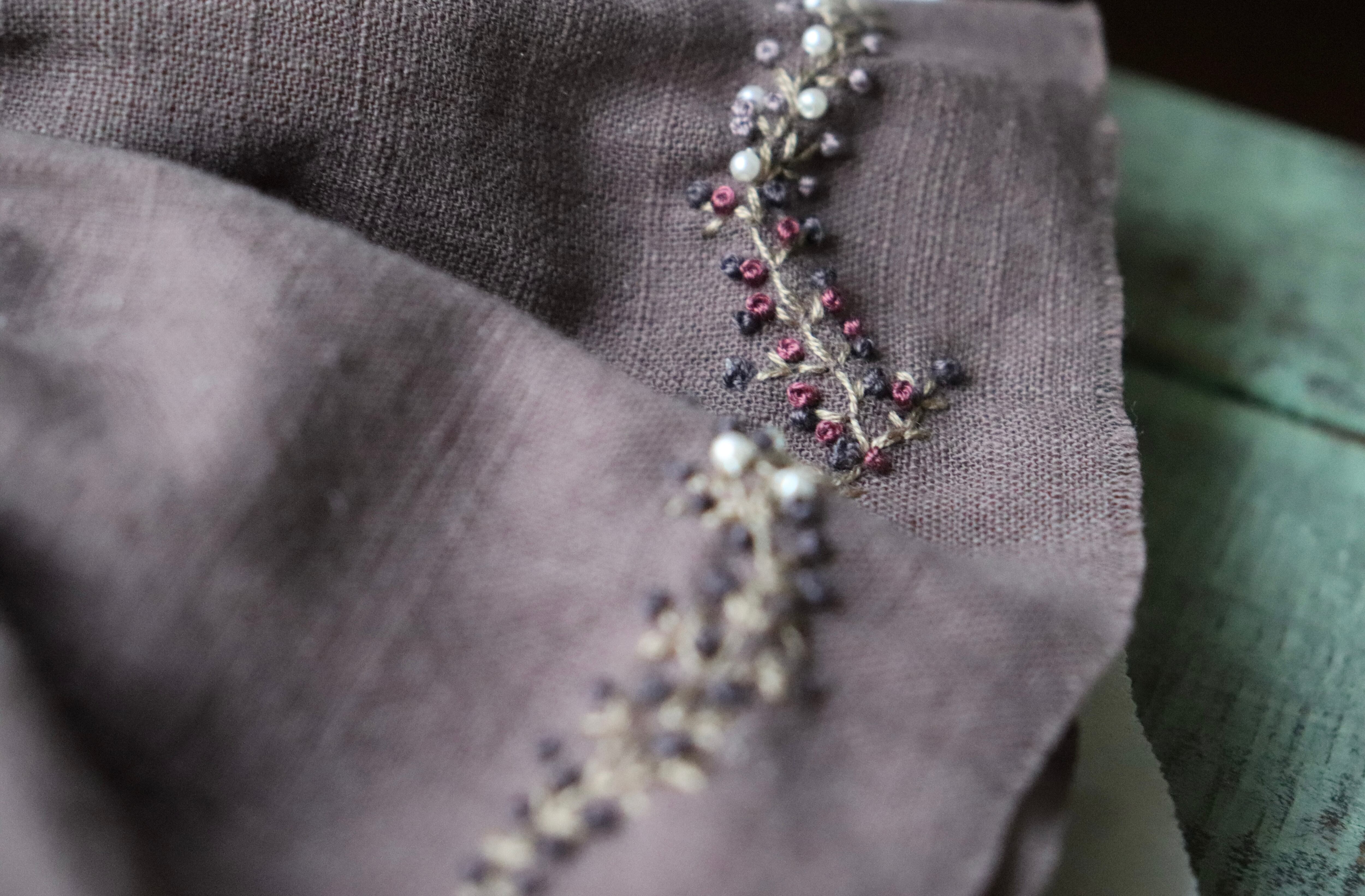 秋色の落ち着いた生地に刺繍をしたワンピース.◌