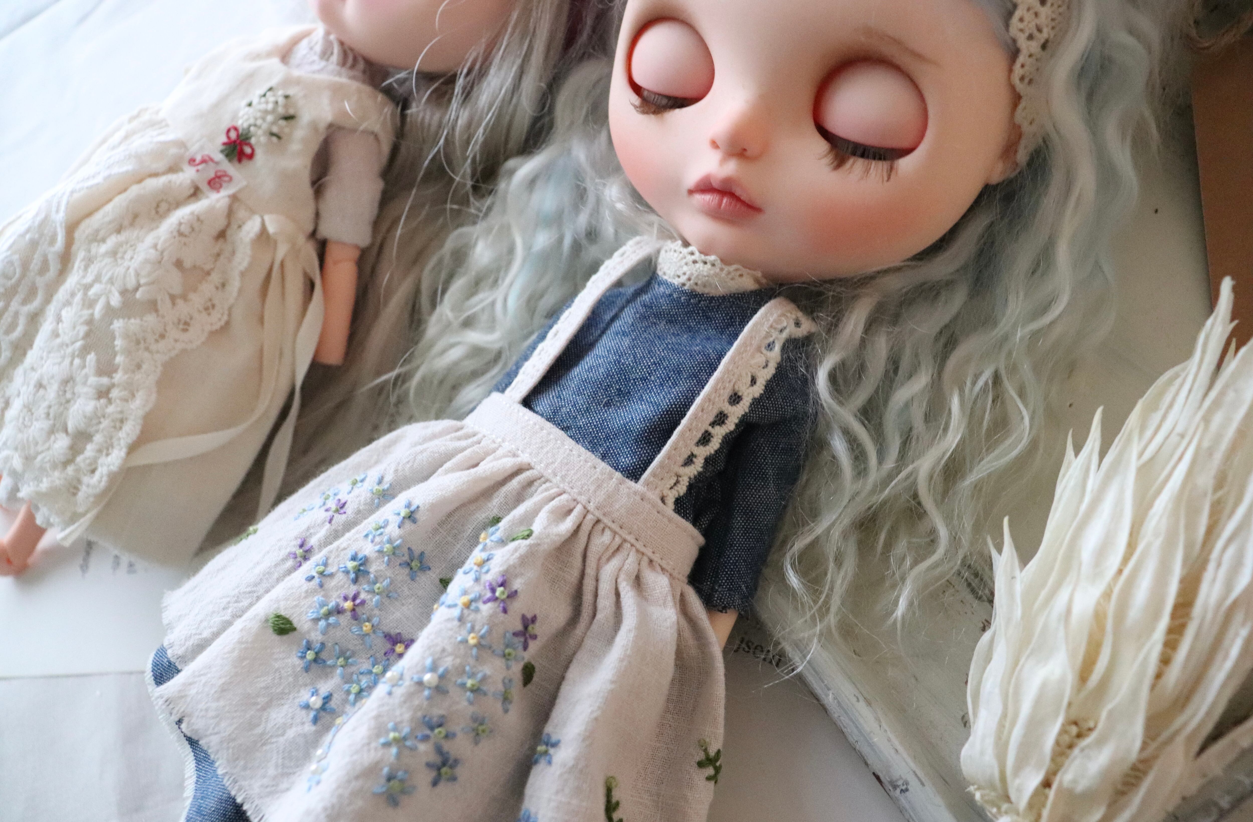 小花刺繍のエプロンワンピースとネイビーワンピースのset