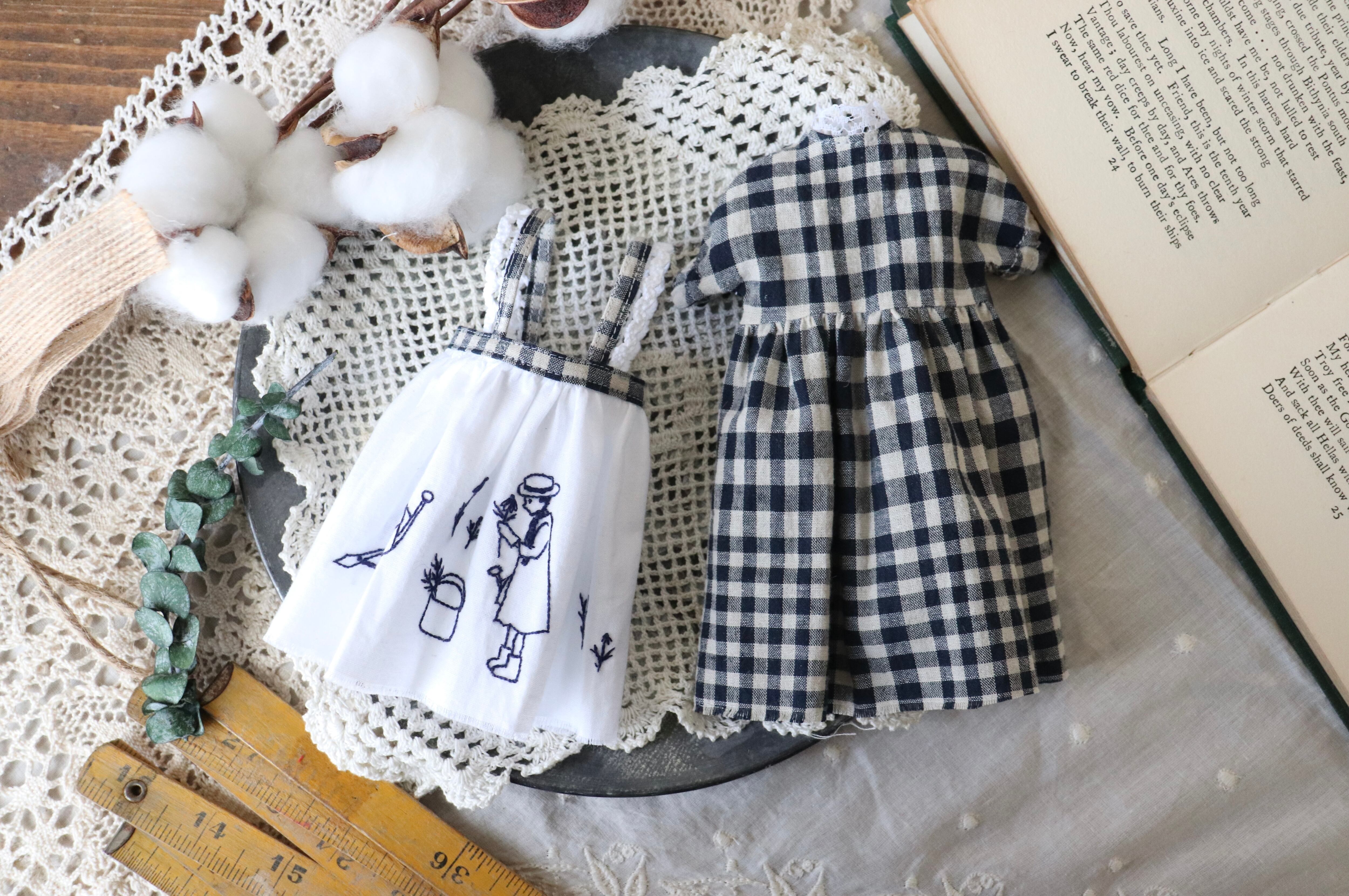 リクエスト再販売・女の子刺繍のエプロンとチェック柄ワンピースのset