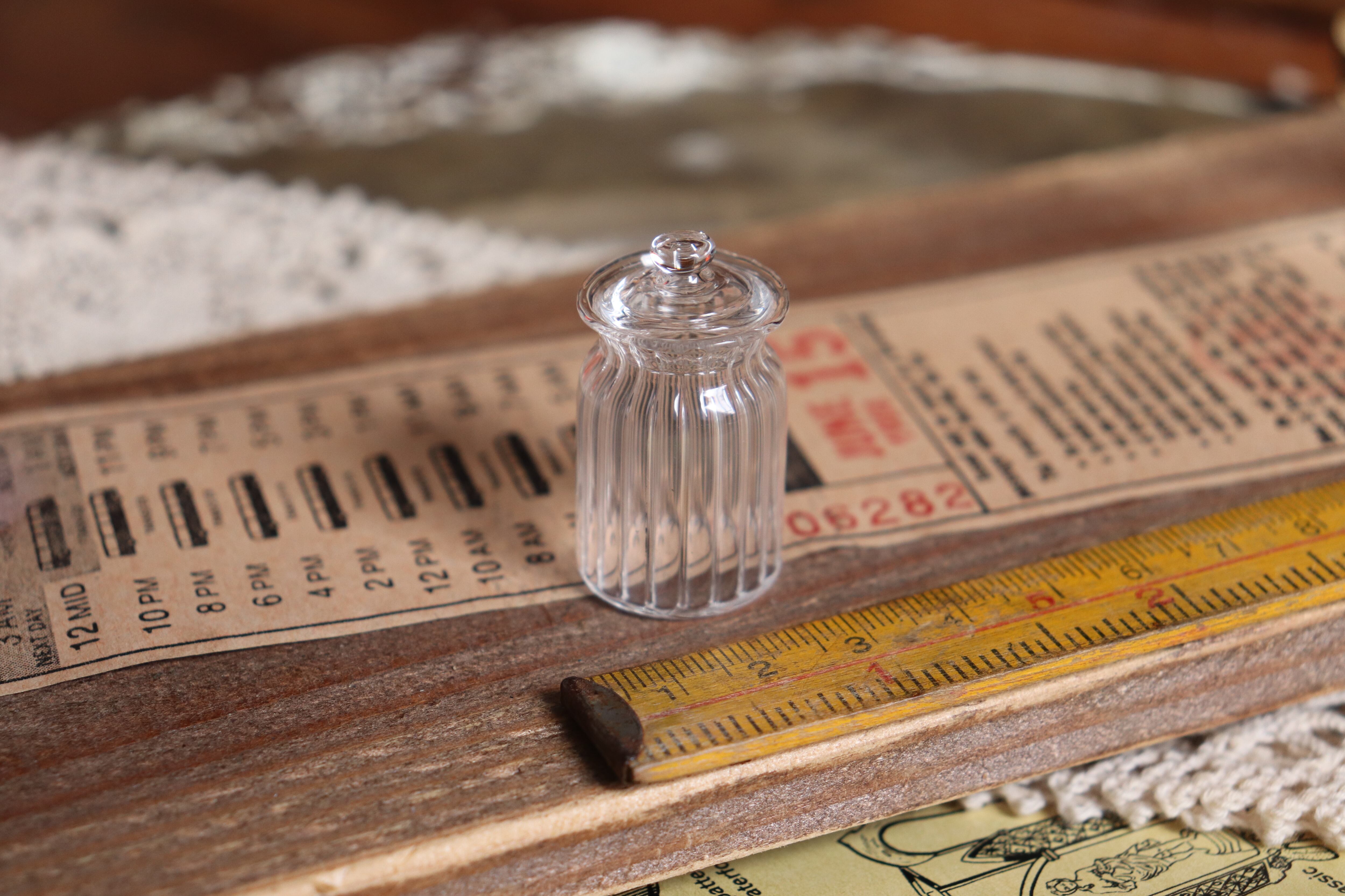 可愛らしいデザインのフタ付きのミニチュア小瓶です。小さな棚等に並べると可愛いです.