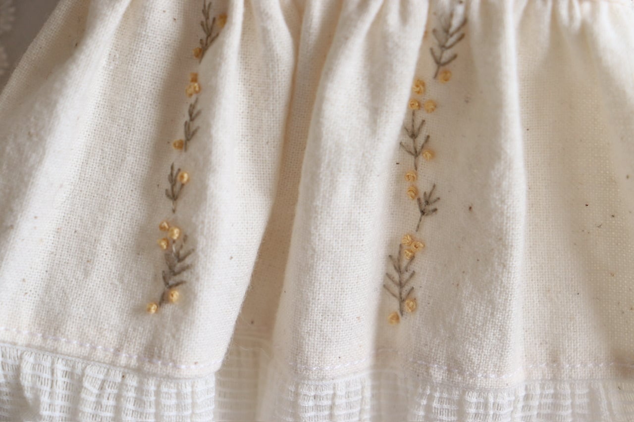ミモザ刺繍のエプロンワンピース